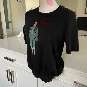 Features: pull over, short sleeve, crew neck, knit, raised graphics of woman and message, rare statement piece