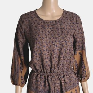 Mix floral style romper with three-quarters sleeves and an elasticized waist line. Open back style with top button closure.