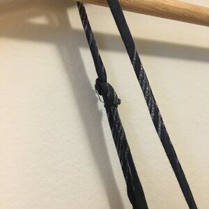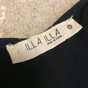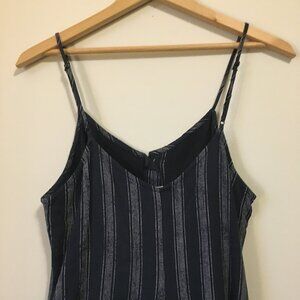 Very good preowned condition, dark navy blue almost black, strappy, rayon romper with white engineer stripes by ILLA ILLA. Straps are adjustable and there are pockets at each hip for storage.
