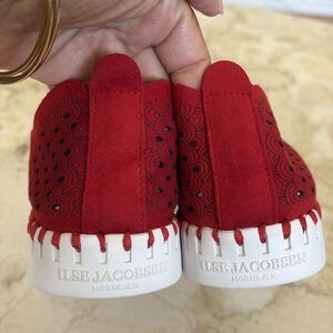In excellent preowned condition the most comfortable shoes you’ll own! Classic ILSE JACOBSEN Tulip slip ons in beautiful deep red. Soft stretch fabric uppers, cushioned soles, comfy removable insoles.