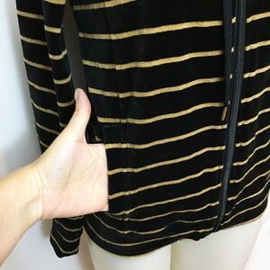 Fantastic velour hoody with Gold metallic stripe, pockets and diamond zipper pull, no flaws.