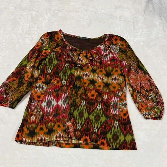 Chic blouse with abstract multicolor design. Features vibrant patterns and 3/4 sleeves. Ideal for a bold look.