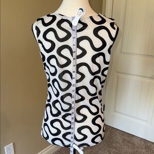 This sophisticated top from INC International Concepts features a striking black and white geometric pattern. The sleeveless blouse has a fitted silhouette and a raw edge neckline. Has some stretch.