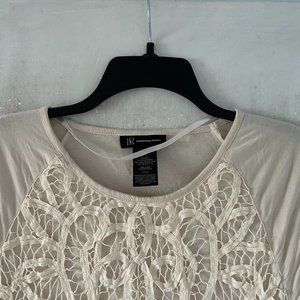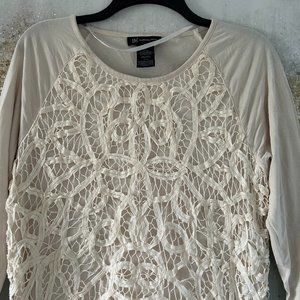 Size: Large. Color: Off White. Body: 100% rayon. Front panel: 100% cotton. Crew neck. Long sleeves. Crochet knit on front.
