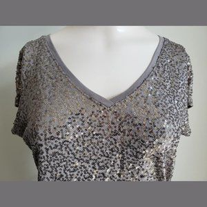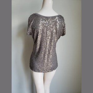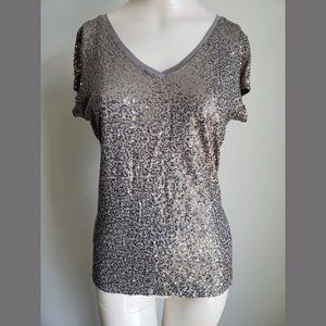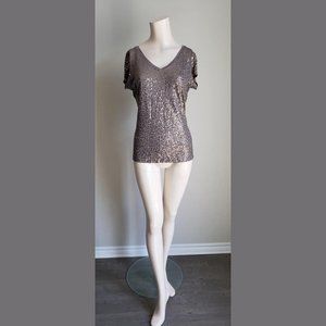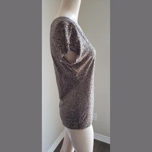 Worn once. V-neck, cap sleeves. The colour is hard to describe but is very soft & pretty. Something like taupe. Sequins are gold. Top has some stretch to it. Top was worn with the I.N.C. Cropped Jacket I am also selling. See my other listing. They went perfectly together. 100% Rayon.