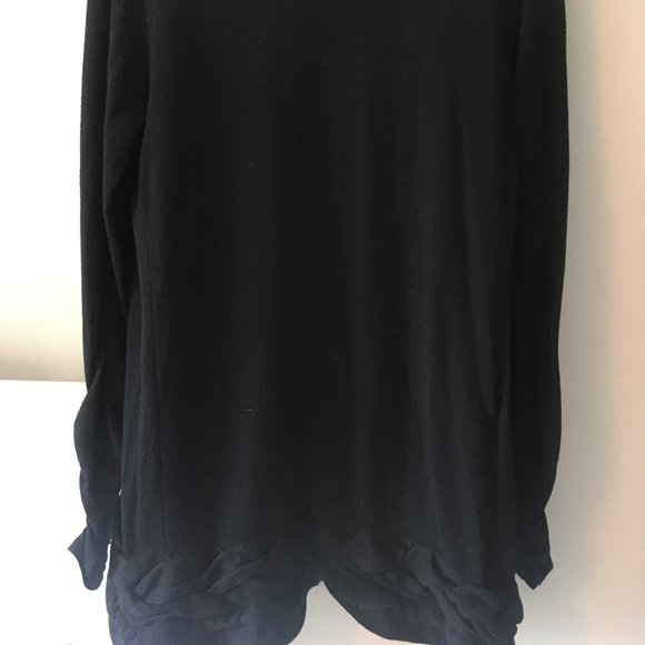 Black cardigan sweater with elegant braid twist detail along collar and hem. Sleeves have subtle shirring at cuffs. Long sleeve length is great for you if sleeves are always too short. Single hook and eye closure at bust line is very flattering. 100% cotton, lightweight sweater is perfect for a cool evening or office environment. Medium fits M-L. Longer length, ends at lower hip. Good used condition.