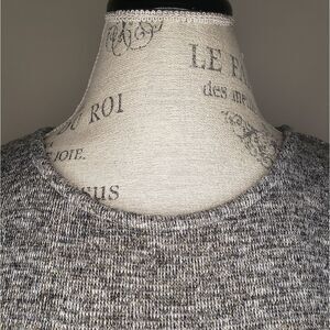 Heather Grey & shiny Metallic Gold woven Knit Scoop Neck long-sleeved Pullover Top with sheer cream peekaboo lining, by INC International Concepts (Petite).