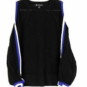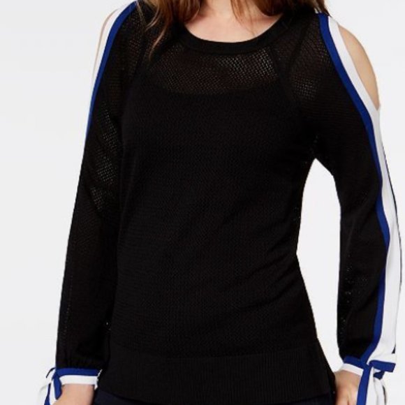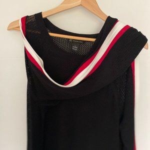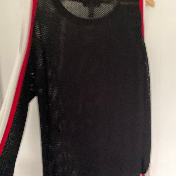 Black with red and white stripes and bows on each wrist. Fun, and sporty but can also dress it up with black slim leg trousers. Like NEW!