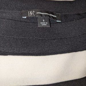 This INC sweater is light weight and perfect for spring or cool summer days. It is black and white with embellished bell sleeves featuring ties and a small metallic/rhinestone loop. The top is in excellent condition - it was worn once. There is a tiny "bump" on the back - I tried to capture it in a photo, but it doesn't show up well. The pit to pit measurements are approximately 15.5".