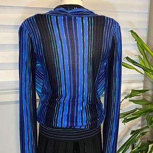 Blue knit with black sequin accent and long sleeve and banded bottom. Beautiful knit with long sleeve long enough to scrunch.