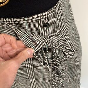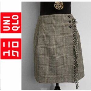 A wool wrap skirt with fluttering fringe. The waist buttons add a subtle design accent. Synonymous with the timeless appeal of Parisian chic. Wrap-skirt design. With a fringe detail at the front. The waist buttons look great with a tucked-in top. Hounds tooth Glen plaid pattern.