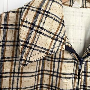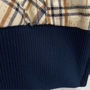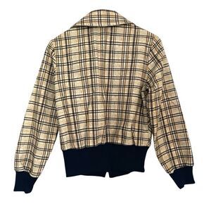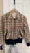 INOV Vintage bomber jacket, navy/beige/brown striped. Dark blue ribbed cuffs and hem. Two front zippered pockets.
