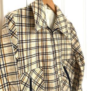 INOV Vintage bomber jacket, navy/beige/brown striped. Dark blue ribbed cuffs and hem. Two front zippered pockets.