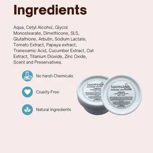 Ingredients: Namnama ethically sourced all the our products and make sure that they are FDA (PH) approved. We also make sure that all ingredients are natural and has no harsh effects. Specific ingredients are as follows: Aqua, Cetyl Alcohol, Glycol Monostearate, Dimethicone, SLS, Glutathione, Arbutin, Sodium Lactate, Tomato Extract, Papaya extract, Tranexamic Acid, Cucumber Extract, Oat Extract, Titanium Dioxide, Zinc Oxide, Scent and Preservatives.