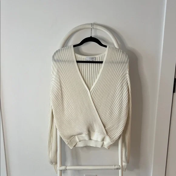 INTERMIX Cream Ribbed V-Neck Wrap Sweater