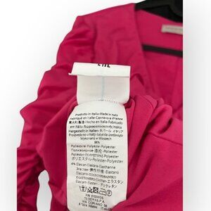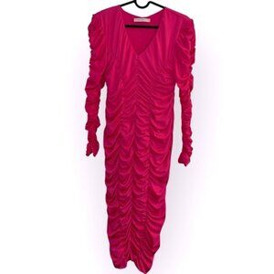 Elegant fuchsia midi dress. Features ruched detailing. Long sleeves with a deep V-neckline. Perfect for any occasion.