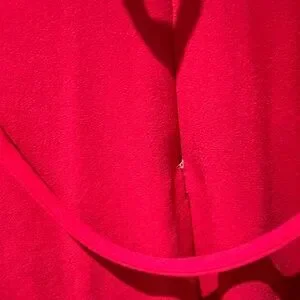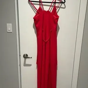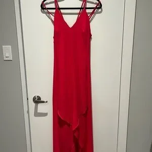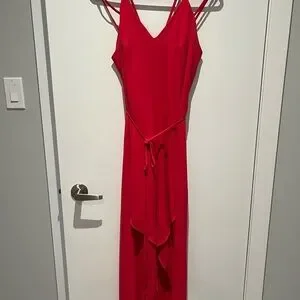 This elegant red dress by INTERMIX is designed for a night out, featuring a sleeveless slip style with a spaghetti strap V-neckline. The asymmetrical ruffled detail and tie front create a sophisticated silhouette, perfect for making a statement at any cocktail event.