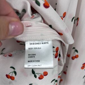 This luxe silk blouse features a playful cherry print along with a chic lace-up at its front. V-neck. Smocked at shoulders and upper backing. Long sleeves with smocked cuffs. Slight peplum hem. Center front slit.Cropped finish. In white/red.