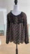 Inwear 100% silk blouse "Lotikka" style. Hidden buttons down the front, scoop neck and black trim around neck and cuffs with an exposed button. Small ruffles like a tuxedo at chest. Black background with small multicoloured bird pattern. Wear this open as a lightweight jacket or closed as a blouse.