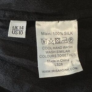 IRIS & INK black 100% silk long-sleeve button-up shirt - Size US 10. The long sleeves and chic cut allow for effortless styling, making it a wardrobe essential that pairs well with jeans, trousers, or skirts for various looks. Crafted from high-quality silk, this top provides a soft, comfortable feel while adding a touch of elegance to any outfit, perfect for both casual and formal occasions.
