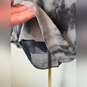 Beautiful lightweight and delicate blouse. Sheer grey and navy tie dye overlay with a navy undelayer. The sleeves are sheer with a bell bottom. Keyhole back with o e button closure.