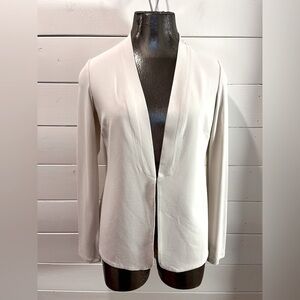 Elegant cream blazer by Iris Setlakwe. Minimalist open-front cut with clean lines and a soft, flattering neckline. Features long sleeves with delicate pleated detail. Two very small spots noted (see photos), otherwise excellent condition.