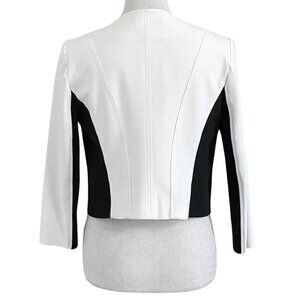 IRIS SETLAKWE SAMPLE WHITE BLACK RIBBED COMBO CROPPED OPEN JACKET STYLE 6291B0, This is a super fancy yet fashionnable and moto-chic vibe cropped jacket in a thin layered white fabric overlapping on each other and stitched perfectly - and a black ribbed side panel for a contrast trendy black & white combo - collarless - open front - half lined - long sleeves. Perfect layer / overcoat for work during spring and fall seasons, wear it over a night out outfit to keep your edge with black fitted pants and boots.
