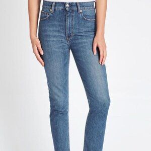 This high-rise jean features a two-toned blue denim wash with a distressed hem and silver hardware
