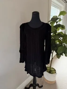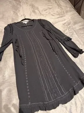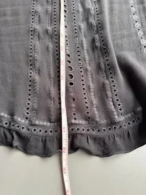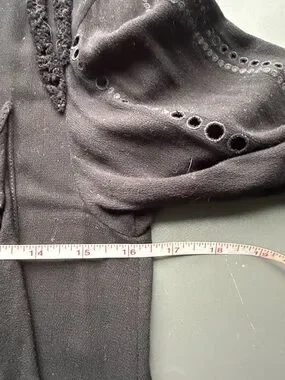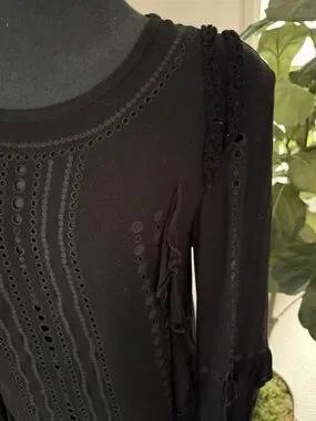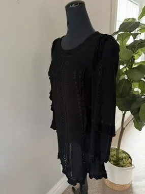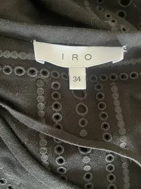 IRO black dress with patterned cut out and ruffles details add g texture as a flattering design element. Chic distinctive black deess can be worn loose or with a belt- belts in pictures for style reference. No rips tears or stains from SFPF home. Pls see pics for tags and measurements.