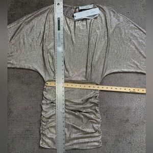 NWT Shine in this elegant sparkling champagne dress (colour is called “gold” but looks more champagne imo) perfect for any occasion. Its sleek design and shimmering color make it a standout piece in your wardrobe. Ruched skirt and batwing sleeve bodice make it super flattering and comfortable. Lots of stretch