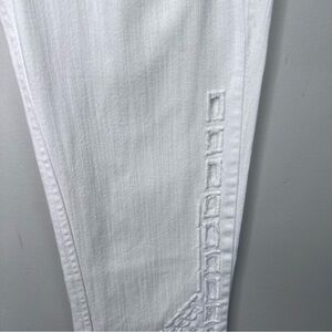 Eyelet cutouts with tonal embroidery detail on the legs. Lightweight, stretchy denim. 5 pockets.