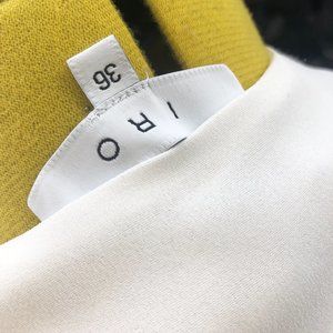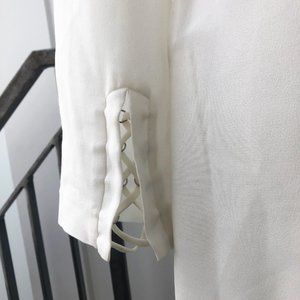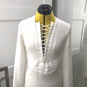 White IRO dress with lace-up at front and subtle lace-up detail on cuffs too. You can lace it tighter or looser to change how deep you want the front opening to show.