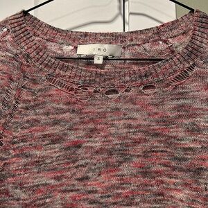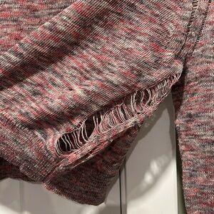 Distressing throughout. Ribbed knit bottom, neckline and cuffs