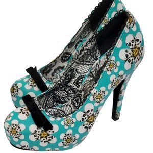 IRON FIST- Platform Pumps Turquoise Skull Daisy Pattern NWOT SZ 5M