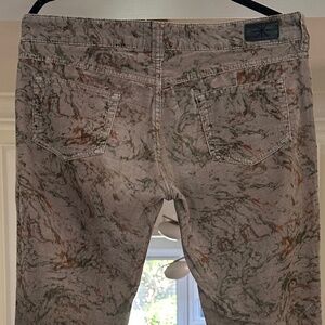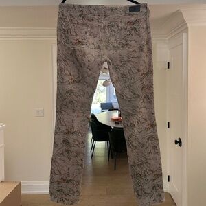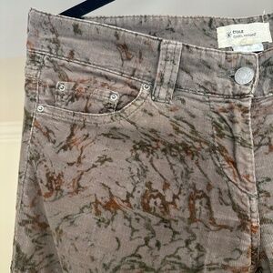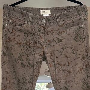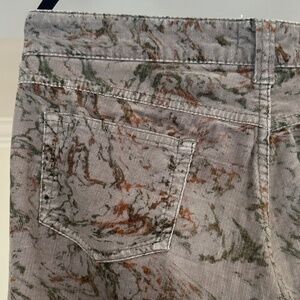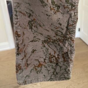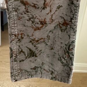 Grey corduroy with abstract rust and green pattern throughouth. Midrise, skinny leg, zip and button closure, multipockets. Black leather Etoile patch on right back waist. Gently preowned, in very good condition.