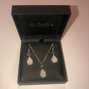 New in box Isara silver tone costume earrings and necklace set - white sparkly druzy stones