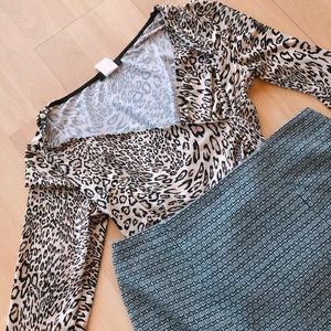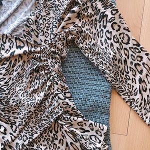 Look wild and fierce in any outfit with this stunning top!! Fun, playful, sexy, flirty, feminine appearance. Features gorgeous cream, tan and black colors with a leopard print. Plunging neck with surplice detail and ruched details on the left side. 3/4 sleeves. Size medium, fits true to size. 96% Polyester and 4% Spandex. Breathable, comfortable and stretchy fabric. 21 inches length. 15 inches pit to pit. Don't hesitate to send me offers! Thank you beauties 🥰😘