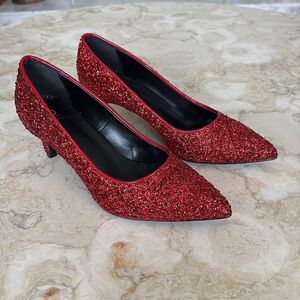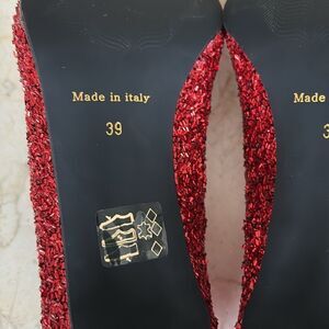 In practically as new condition stunning Isabella Lorusso red sequinned evening pumps. Pointed toe, sensible 2” heel, comfortable leather footbed. Made in Italy.