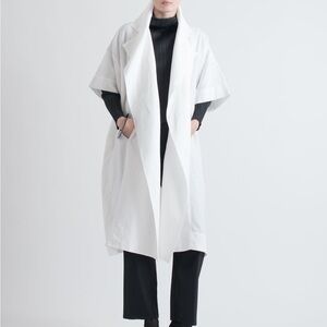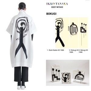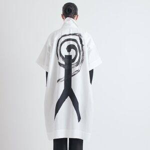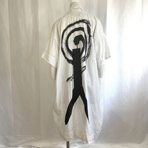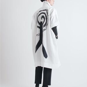 ISSEY MIHAKE IKKO TANAKA DUSTER LINEN VINTAGE JAPON 1996 COLLECTION BUTTONLESS GRAPHIC PAINTING PRINTS COLOUR WHITE BLACK SIZE 6
