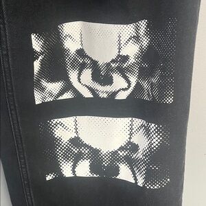 Stylish black jeans featuring unique IT graphic elements. Wide leg fit for a modern look. Size 5, 37 cm across waist, 110 cm length, 80 cm inseam!