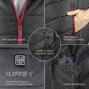 IUREK heated vest adopts premium DuPont cotton and advanced technology that provides first-class heating performance. It's breathable, lightweight, waterproof, windproof, machine washable, and more durable than other heated clothing on the market. The vest will provide overheating protection to keep you safe. It features 4 carbon fiber heating elements generating heat across the collar, midback, and two exterior zip pockets. With 7.4V 10000mAh battery pack, the heated vest delivers from 6-10 hrs heat and allows you to stay warming and enjoy outdoor winter activities longer than ever before. Also, it can power your smartphone and other electric devices. 4 Heating Settings: Long press for 3s to turn on the preheat mode can make you feel toasty warm in seconds. Simply press the touch-button to adjust the heating levels, (Low 100°F/Medium 113°F/High131°F) according to your needs. A must have for the winter outdoor activity lover, construction worker, lineman, or anyone who works outside for extended periods in the winter season