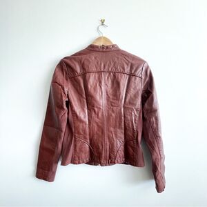IVANKA TRUMP Faux-Leather Brown Moto Jacket Ribbed Side Panels Women's S Pleather. Layer on chic, biker style with Ivanka Trump's faux-leather moto jacket. Band collar with snap closure. Zipper pockets at waist. Motorcycle jacket styling; fake leather, perforated yoke detail. Ribbed side panels. Lined. Wipe clean. Very good used condition. Please see photos for approximate measurements.