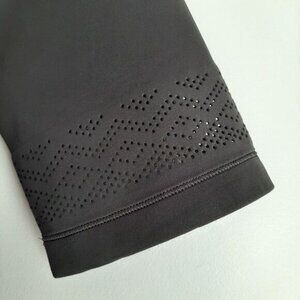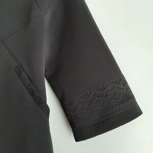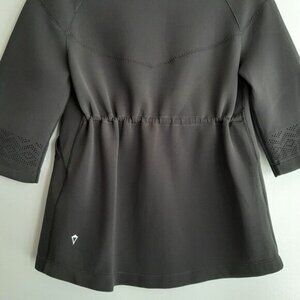 • Elbow length sleeve pullover top in black with laser micro dot cut-out at sleeve hems and inner hidden toggle and drawcord at the waist.