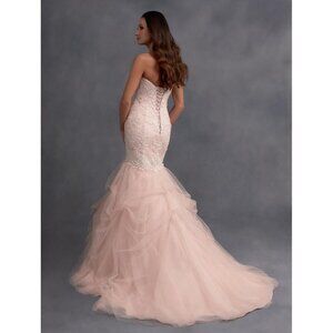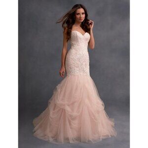 This gown is a floor model and has been tried on . It is in excellent sample condition. More pics to follow. The designer pic is blush, but this size version is in IVORY