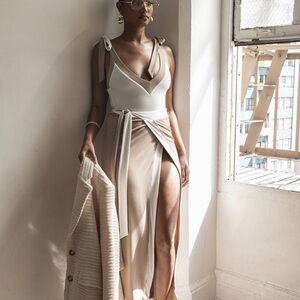 Unlock a world of style & versatility with our Reversible Collection. Introducing our favorite bodysuit this season, the Ivory Contrast Kamie Reversible bodysuit. This reversible piece features a fully lined bodysuit with plunging v-neck, bow-tie shoulder straps, and a thong back cut. Crafted in a smooth double-lined fabric, it can be reversed to reveal a new look in a beige and ivory shade.