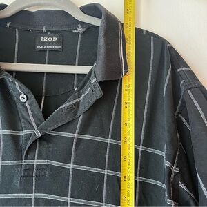 Vintage IZOD black polo shirt with gray vertical and horizontal pinstripes. Features double mercerized cotton for a smoother, lustrous feel and added durability. Tag is missing, but measurements suggest it fits like a men’s L.. Great for fans of retro menswear and timeless polo silhouettes.