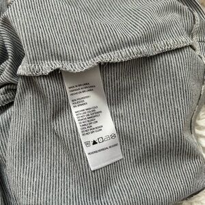 Grey and white striped short sleeve t-shirt. Size medium. Subtle graphic design. 95% polyester, 5% spandex.