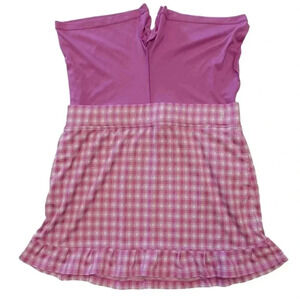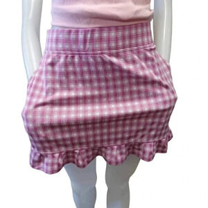 Pink plaid in color this skort has a wide waistband and two mesh lined flat pockets. It has pleats in the back and a pretty ruffle in bottom of skirt.