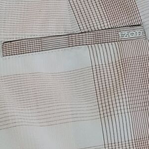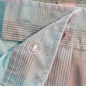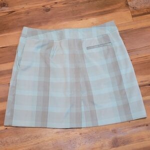 IZOD XFG COOL FX Golf Skort. Light teal with a brown stripe pattern. The skort features two side pockets and a pocket and slit in the back. The skort has a two button and zipper closure with an inner button at the waistband.