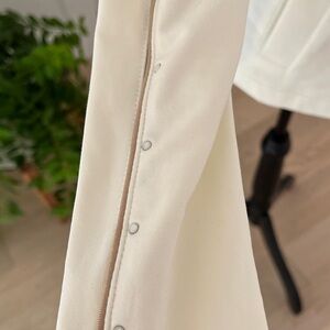 Izod XFG Xtreme Function Golf Jacket is cream coloured with a grey stripe and decorative pearl-like accents on the sleeves. Zipper front with snaps. Side slash pockets. 92% Polyester/ 8% Spandex blend.